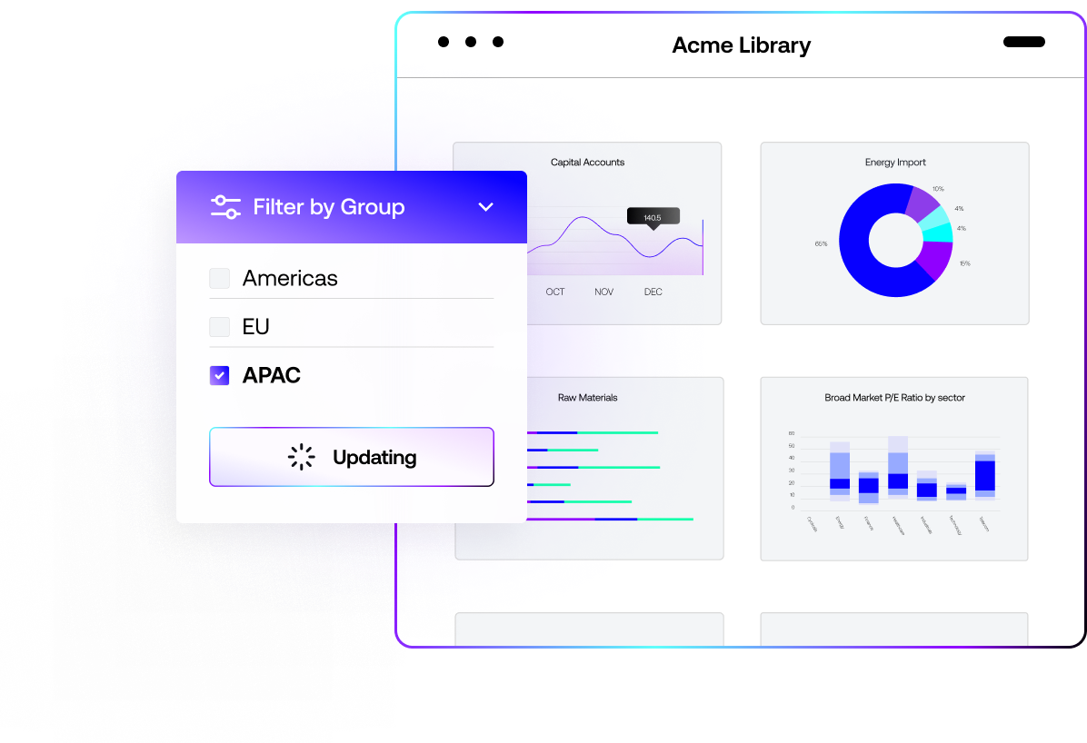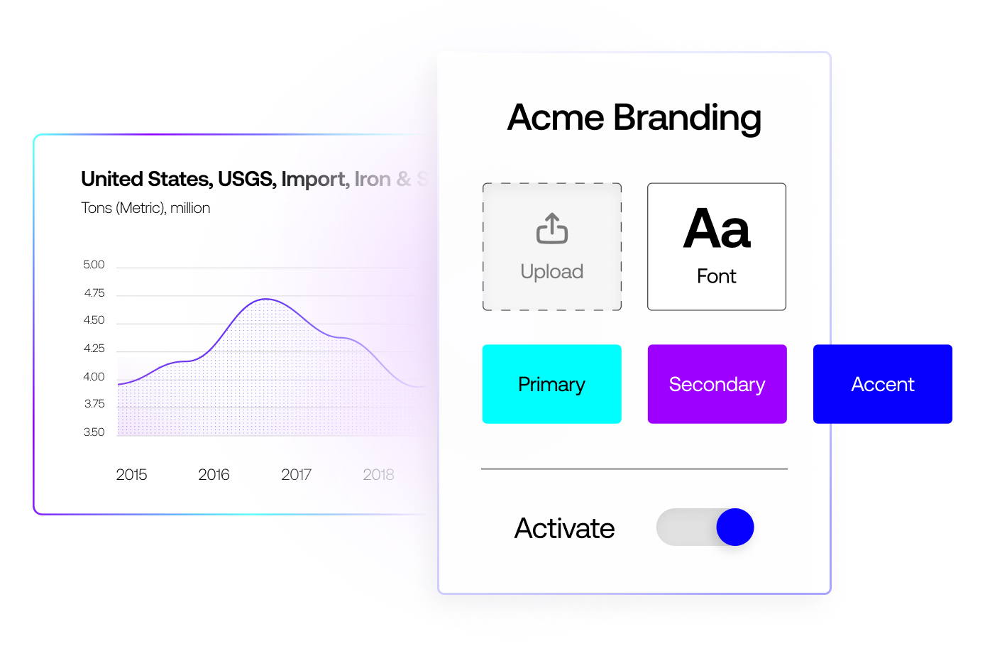 Get your analysis ready without losing momentum. Apply brand fonts, colors, and logos automatically so every visual looks consistent and professional. Charts stay linked to real-time data, so you can pull an old chart off the shelf and have it immediately up to date and relevant.